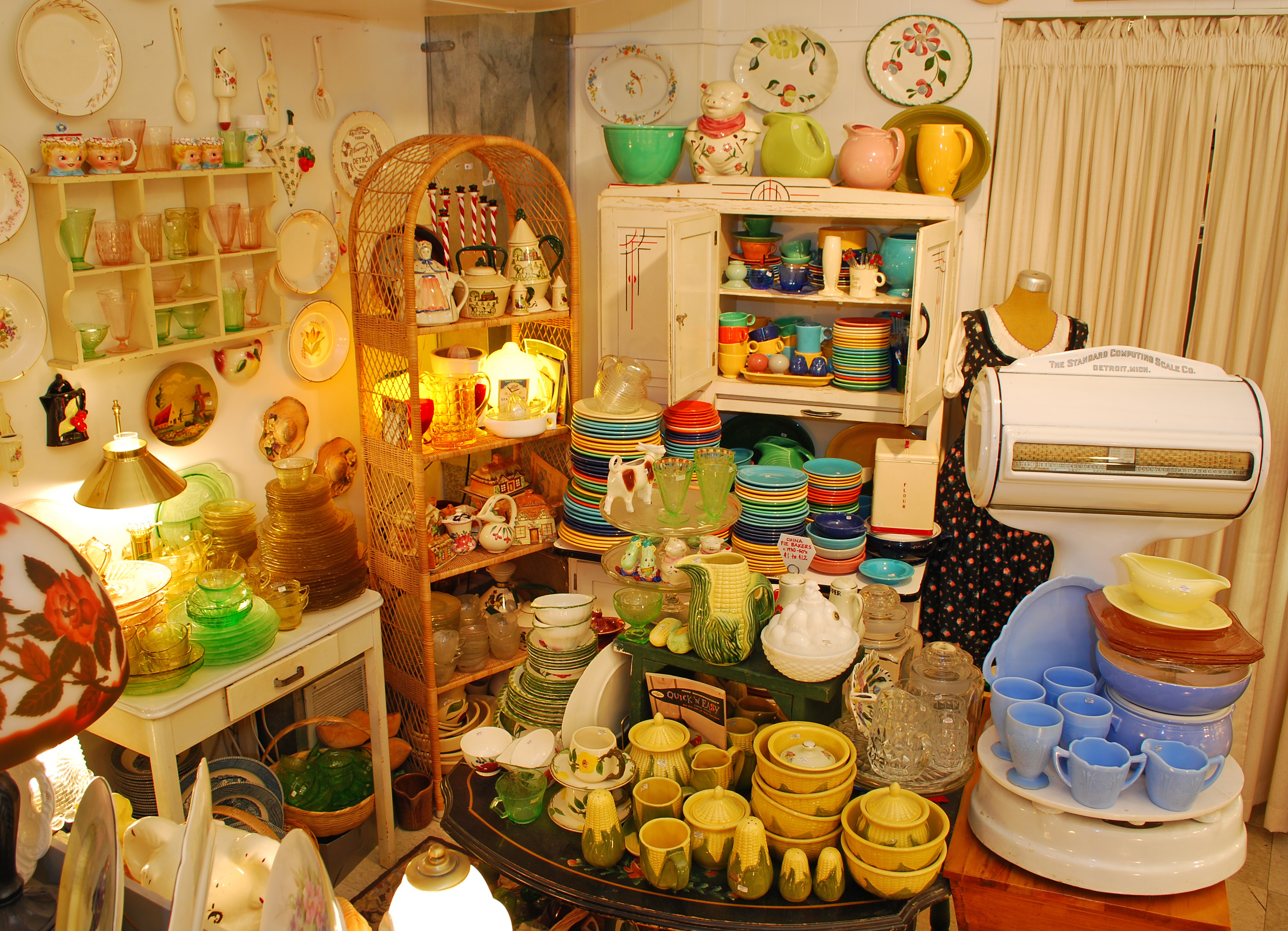 Our "kitchen" displays glass and china from 1920 to 1950.